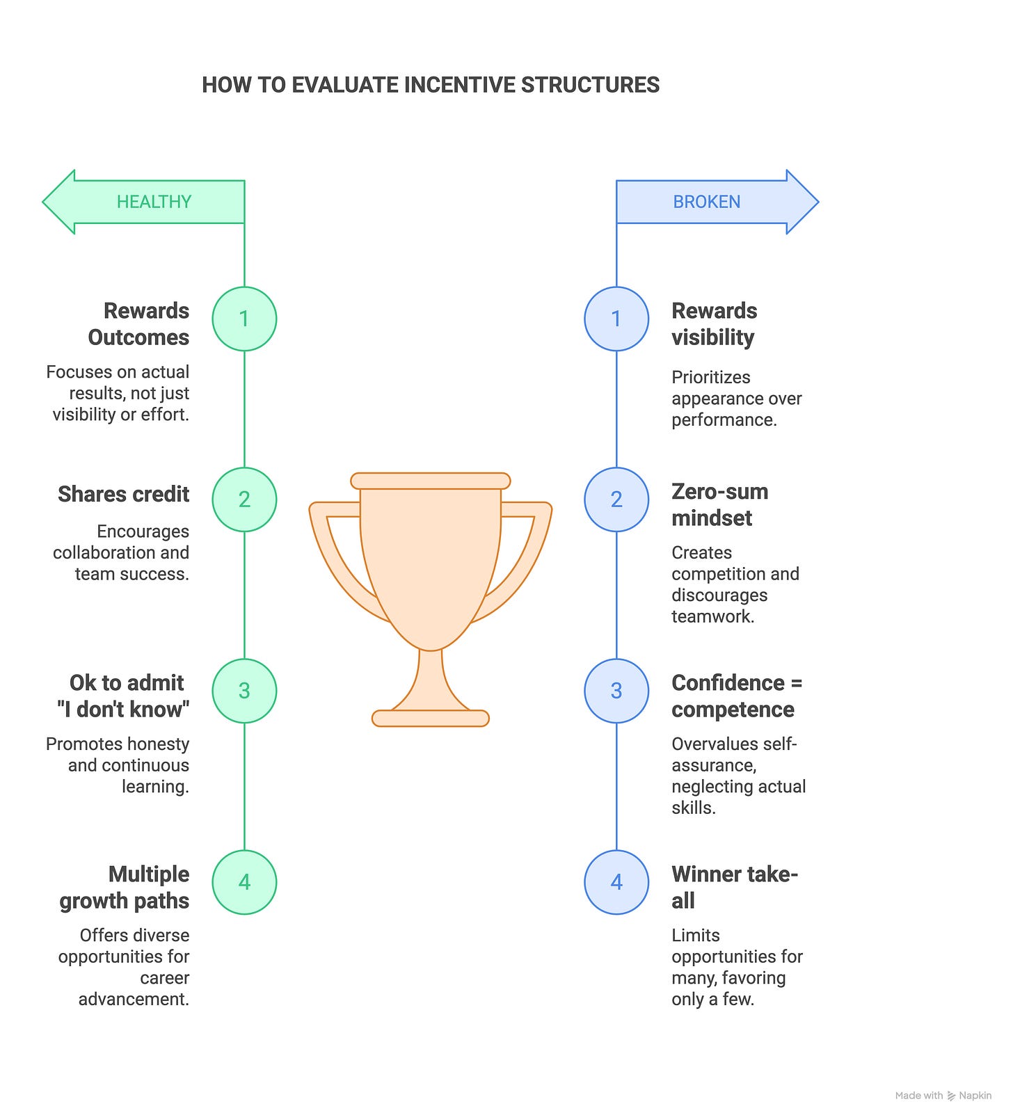 Here’s the hard truth for leaders: If your incentive structure is broken, your best people are already looking for the exit. And the people who stay? They’re optimizing for the game you’re actually rewarding, not the one you think you designed.