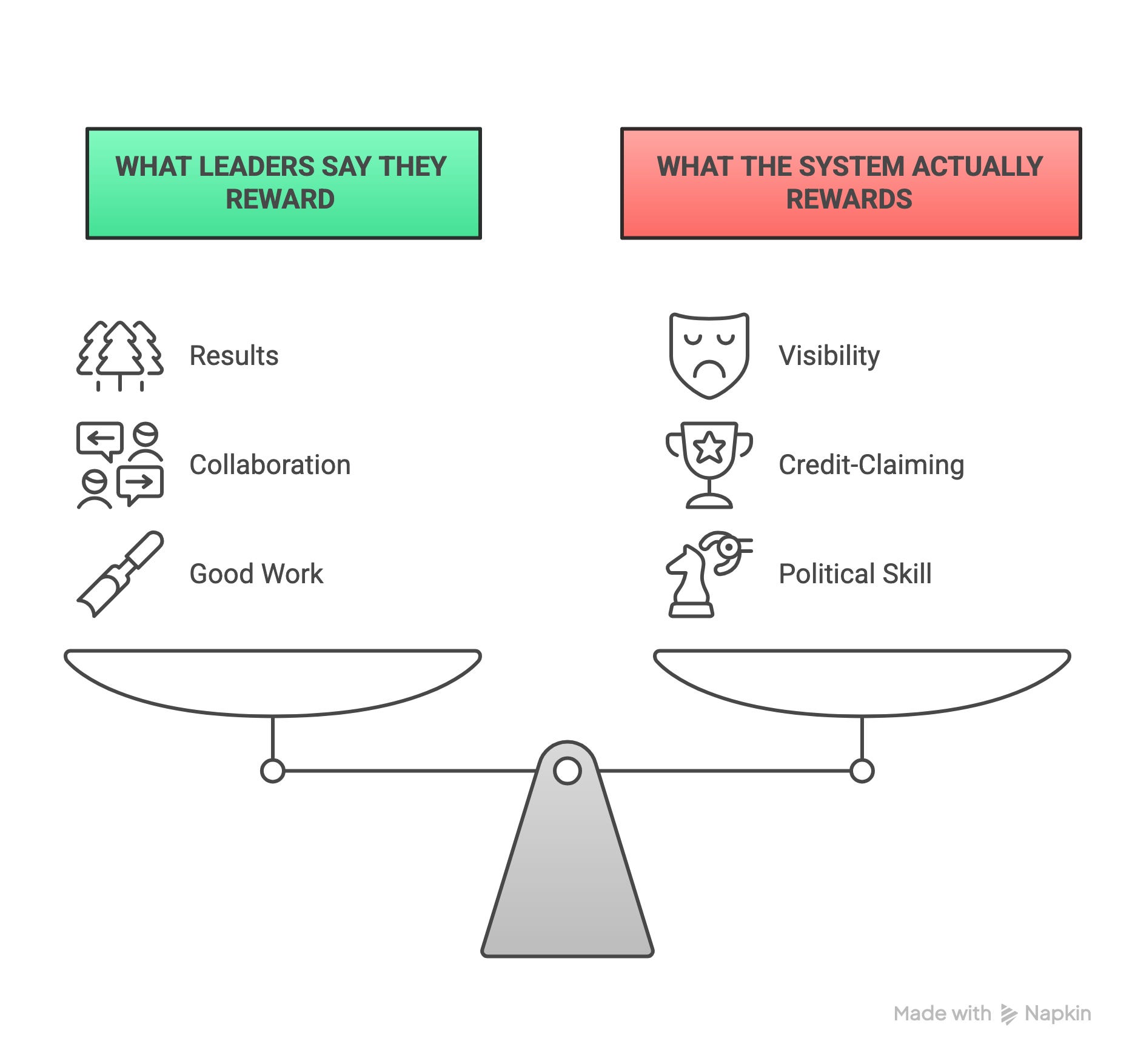Visibility matters more than results. People spend more time promoting their work than doing good work. Whoever tells the best story wins, regardless of actual impact. Leadership rewards the person who “owns the narrative,” even when they did not deliver the outcome.